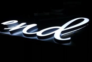 - Контражурная подсветка: светятся контуры букв, что достигается с помощью светодиодных лент или гибкого неона. Такой стиль уместен в минималистичных и элитарных интерьерах. Их особенность заключается в лицевой поверхности, которую выполняют из светоблокирующего материала. Это позволяет добиться необходимого свечения.